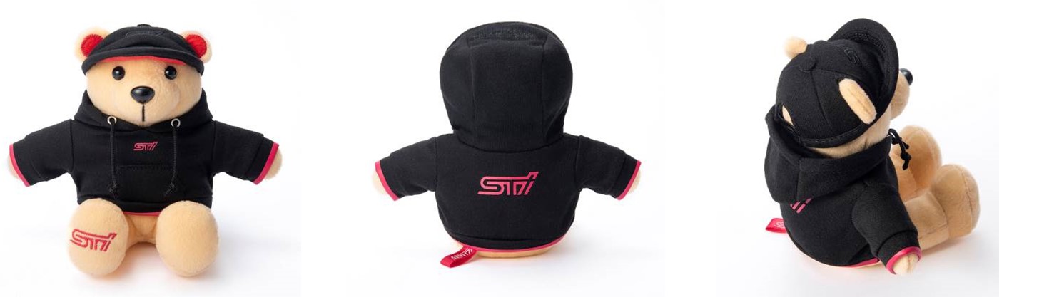 今回のベアには、STIの人気アイテム「STIスウェットパーカー」と「フラットキャップ」をまとい、