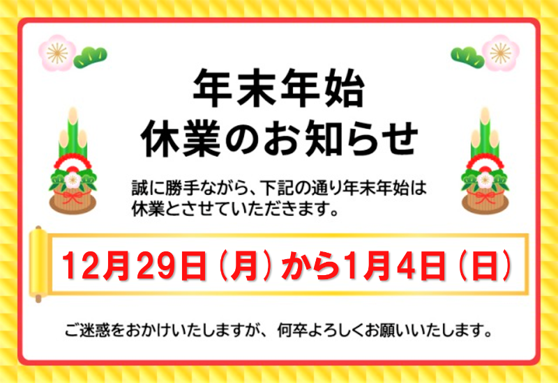 12月29日(月)から1月4日(日)まで休業させていただきます