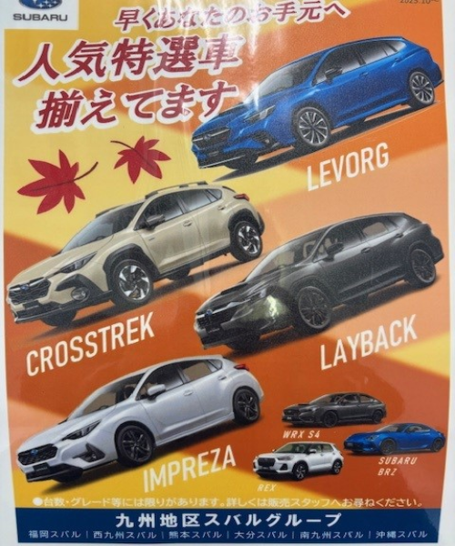 現在、福岡スバルでは納期の長期化を解決するため、人気の車種、カラー、グレード、メーカーオプションを厳選し、先行発注を行っております。