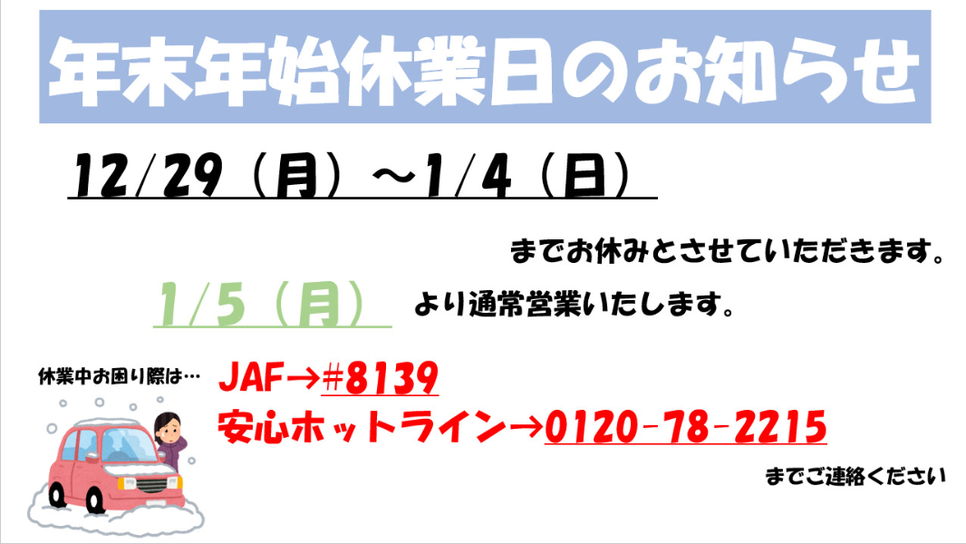 こんにちは‼櫛原店です(^▽^)/早いもので、今年も残すところあと5日になりましたね~!本日は年末年始の休業のお知らせでございます♪ご不便おかけいたしますが、何卒ご理解の程よろしくお願い申し上げます。 2025年もありがとうございました!2026年もよろしくお願いいたします♪皆様、よいお年をお迎えください