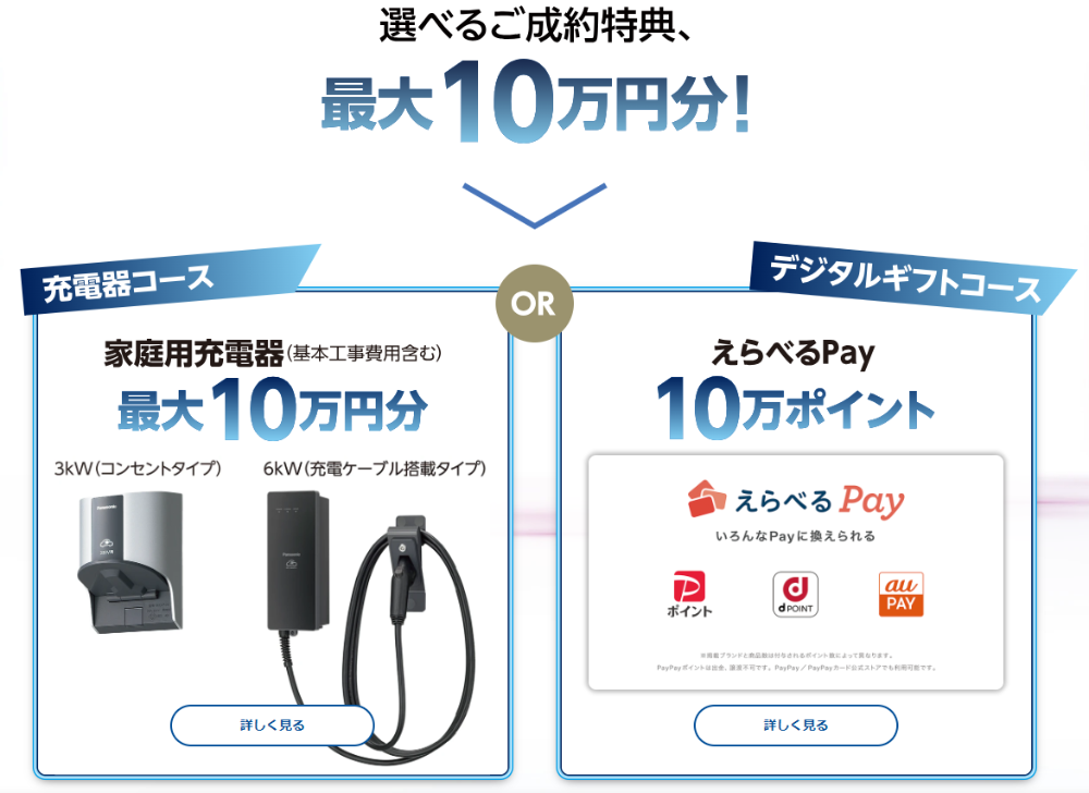 家庭用充電器設置費用補助も選べる10万円分の特典が付いてきます!!ヽ(; ゚д゚)ノ