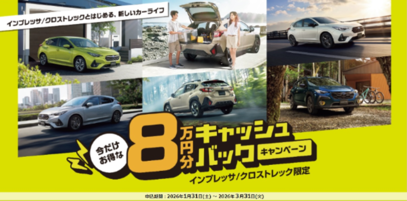 「インプレッサ/クロストレック限定 8万円分キャッシュバックキャンペーン」。