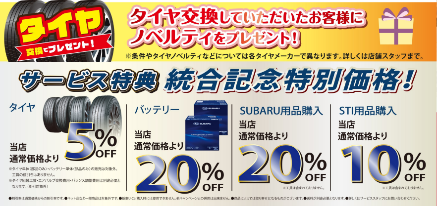 お得にスバル車やタイヤ、バッテリー、その他用品を手に入れられるチャンスとなりますので是非ご検討ください!