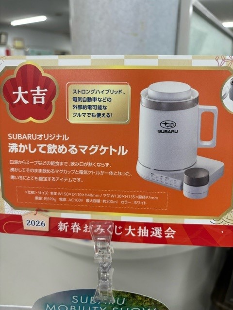 皆様、新年あけましておめでとうございます。昨年は大変お世話になり、ありがとうございました。本年も武雄店をどうぞよろしくお願いいたします。1月5日(月)から18日(日)までSUBARUの新春初売りフェアを開催!空くじなしのおみくじ抽選会を行います(#^^#)2026年も皆様にとって幸せな良い一年になりますように。今年も皆様にお会いできるのをスタッフ一同、楽しみにしております。