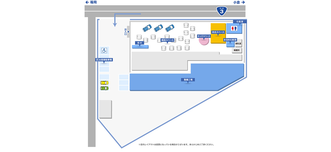 近隣にも多く自動車ディーラーがある国道3号線沿いのお店です。授乳室や車いす用駐車場などどなたでも快適におクルマをお選びいただける環境が整っております。点検等の整備のお客様もぜひ八幡店でゆったりとしたひと時をお過ごしください。 |