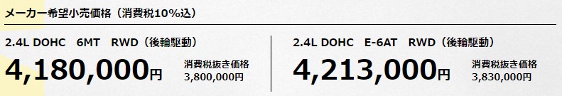 価格は以下の通りで、トランスミッションの選択肢にはオートマとマニュアルが用意されています。