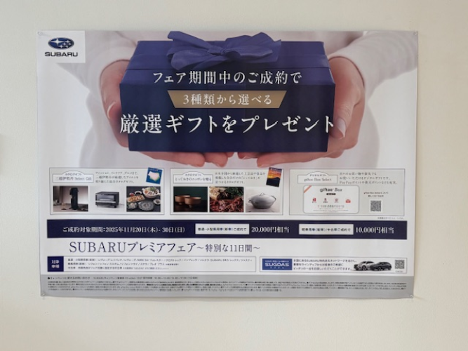 11月30日までに新車・中古車のいずれかをご成約頂いたお客様にカタログギフトもしくはデジタルギフトをプレゼントいたします。
