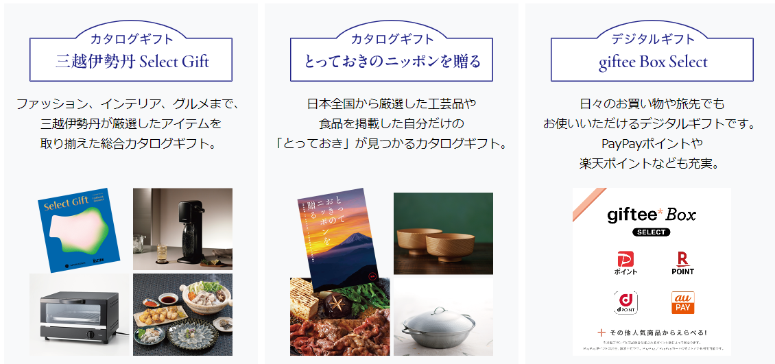 カタログギフトは、【三越伊勢丹Select Gift】、【とっておきのニッポンを贈る】のどちらかから1点、