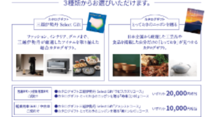 幅広い選択肢から厳選アイテムを選べるカタログギフト2種と、日々のお買い物や旅行にお使いいただける