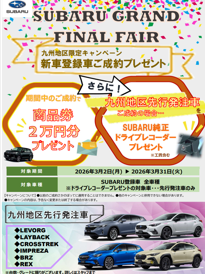 3月2日から SUBARU GRAND FINAL FAIR が始まっております。