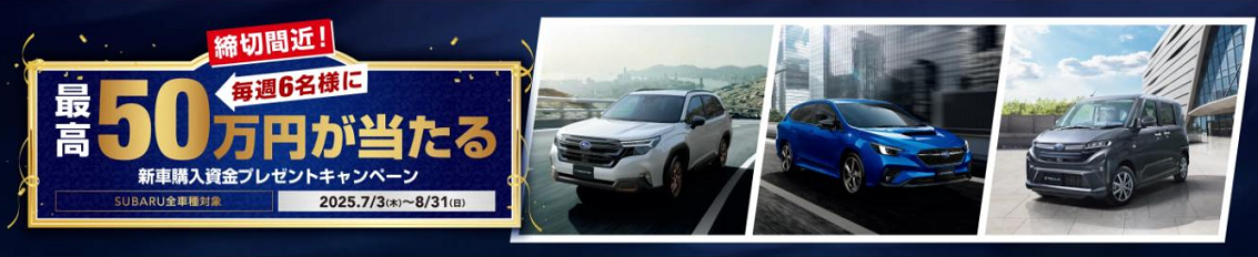 SUBARUの全車種対象で8月31日までにご応募いただくと9月4日の16時以降に当選発表となります♪