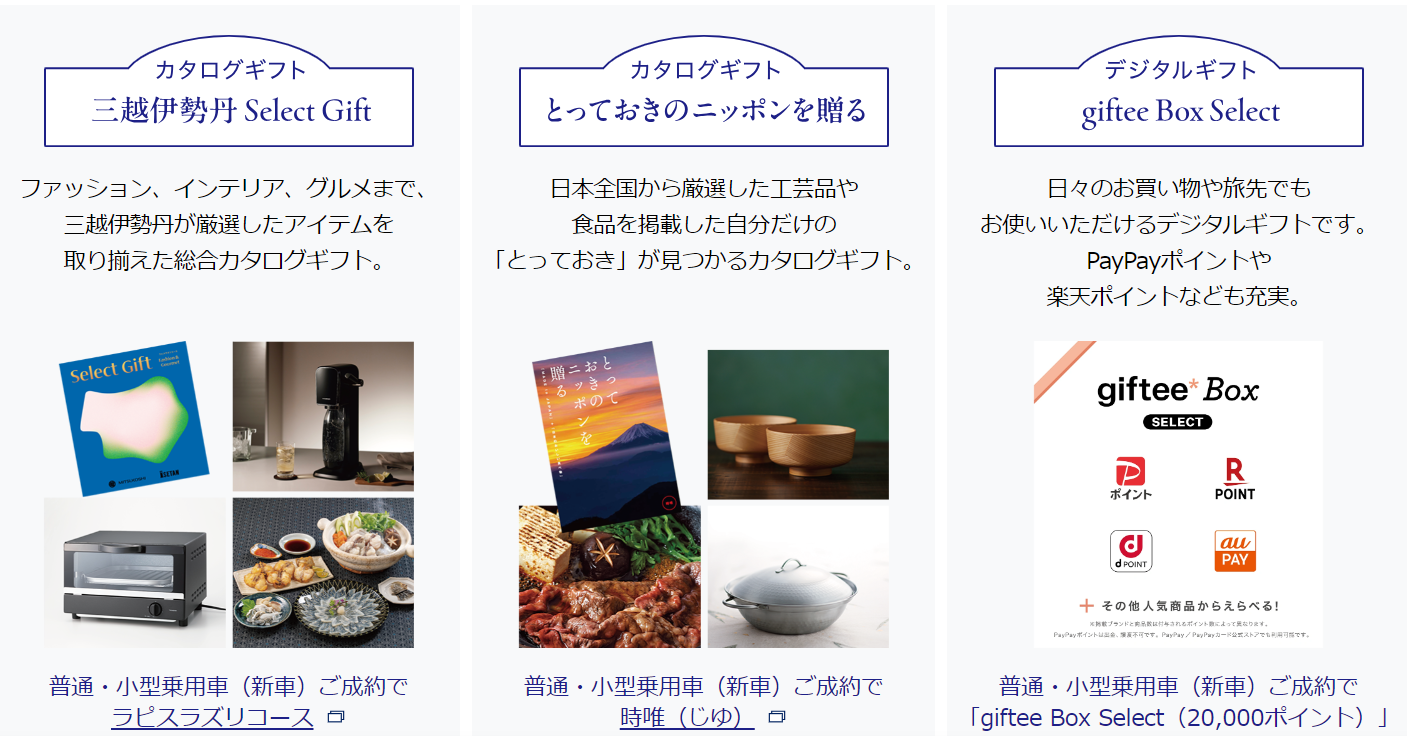 期間中に新車・中古車をご成約いただいたお客様には、選べるご成約ギフトをご用意しています。